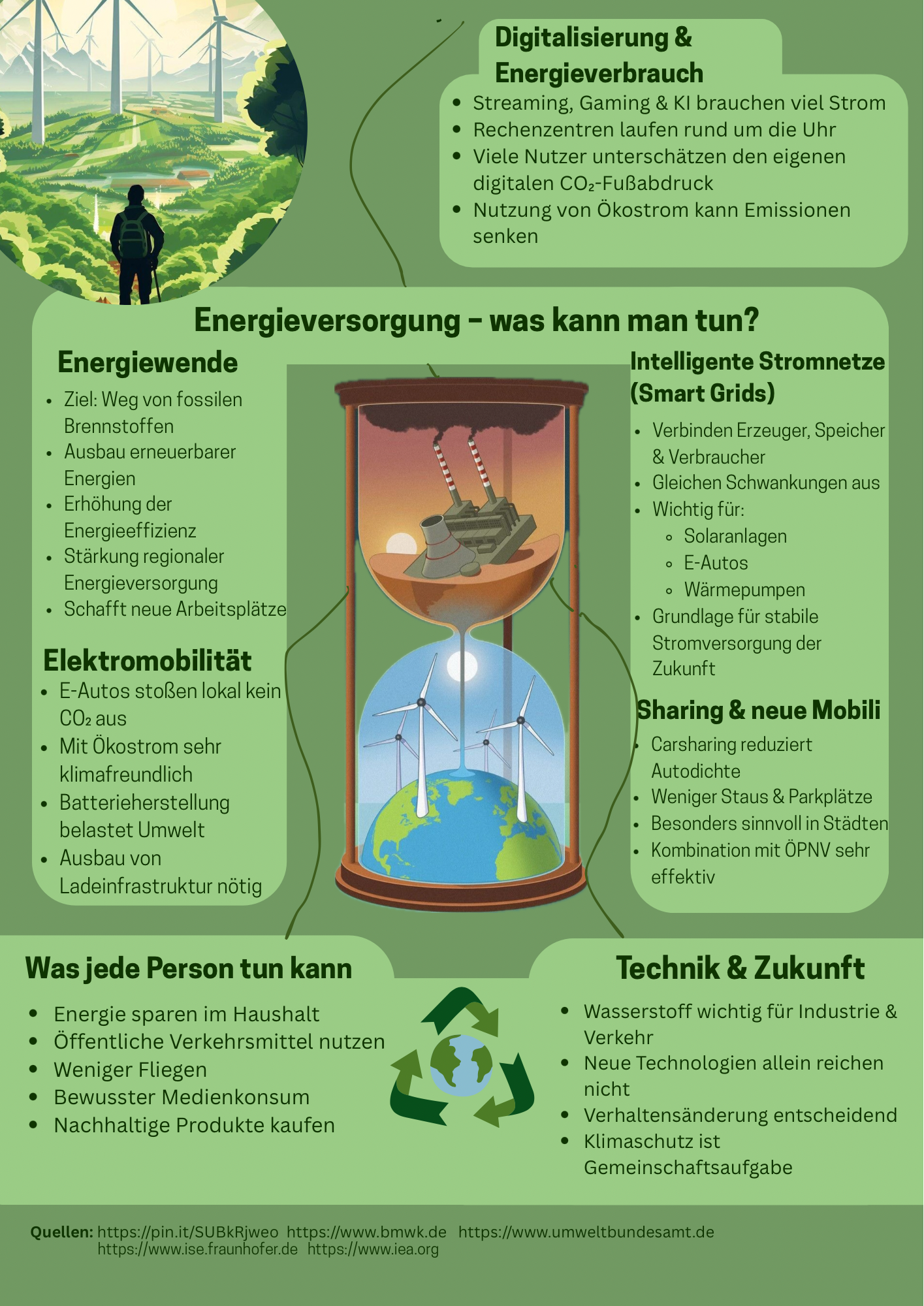 Liebe Schlossgeister, heute wollen wir euch mal einen kleinen Einblick in den Geographie Unterricht der Klasse 9 geben. Dort hat sich Leonie Feix ganz besondere Gedanken über das Thema Energie und Klimaziele gemacht. Denn dieses Thema wird immer wichtiger für uns. Sie gestaltete einen sehr schönen und übersichtlichen Flyer, den wir euch nicht vorenthalten wollen.